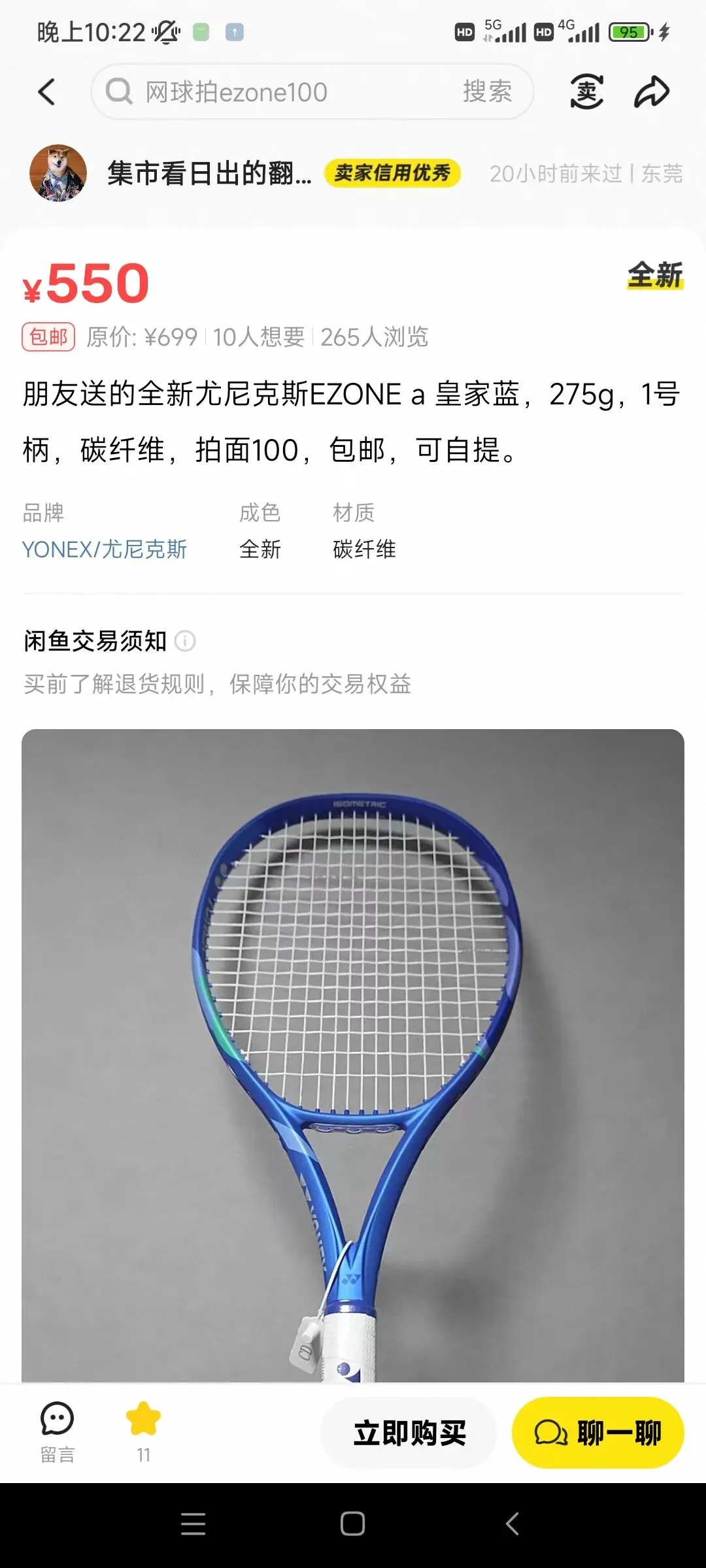 高性价比入门与进阶首选(400-600 元区间)这个价位段是二手 EZONE 的“甜点区”,能买到成色极新甚至全新的 8 代(08)系列。对于想要体验皇家蓝配色,但又不想承担全新溢价的朋友,这里有几款参数非常主流的型号:全新未拆封的捡漏:有朋友赠送或仅试打的全新拍,价格远低于专柜,适合追求“零使用痕迹”的您。准新闲置:买家购入后仅上过几次课或因故闲置的球拍,通常还带着购买记录,性价比极高。经典糖水拍:275g-285g 的黄金重量,100 平方英寸大拍面,容错率高,非常适合从初学向进阶过渡。