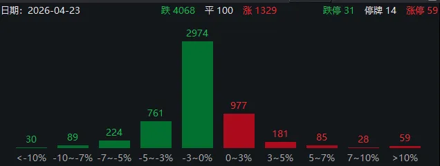 今天市场回调:上涨1329,下跌4068,涨停59,跌停31