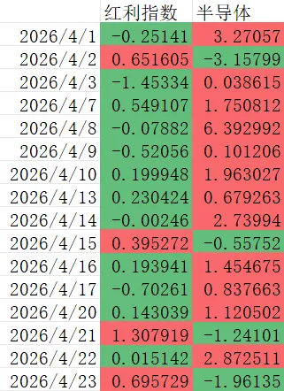 一头红利,一头科技,市场风格就像一个跷跷板一样的上下切换。我把这个月红利指数和半导体指数(作为科技代表)的日涨跌幅做了一个汇总,如下图,看的更加清楚: