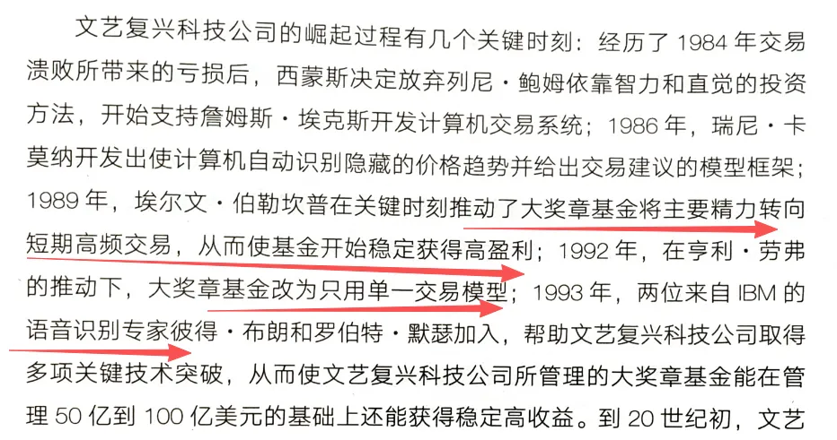 这个大奖章基金后来都不对外募资,大部分的钱是公司内部员工,同时西蒙斯对于保密制度极其严格,所以关于这基金是怎么取得这么恐怖成绩的,大家一直都不太清楚。这本书里,倒是提到了一些内容,我还没有全部看完,序里明汯的裘总有总结: