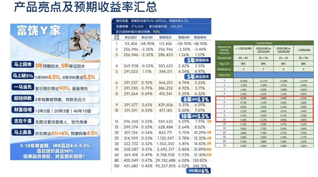 图6:「富饶盈家」收益演示图,标注3年回本、第8年IRR突破5%等关键节点
