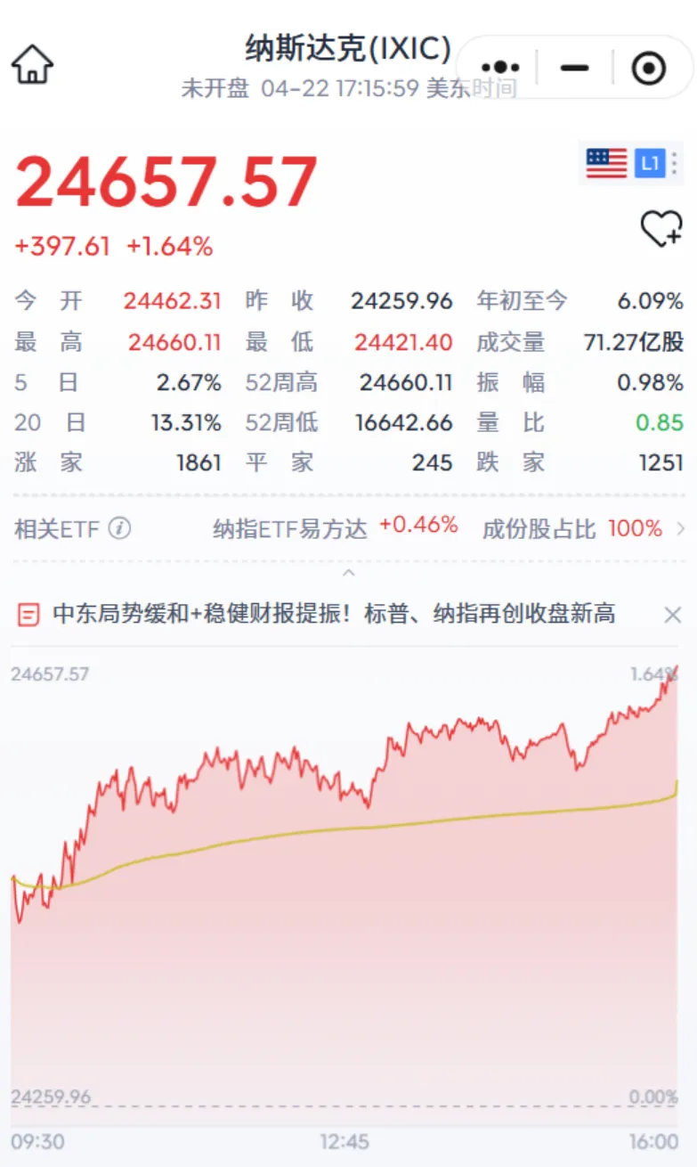 2026.4.22纳斯达克指数再创历史收盘新高美东时间 4 月 22 日收涨 1.64%,报 24657.57