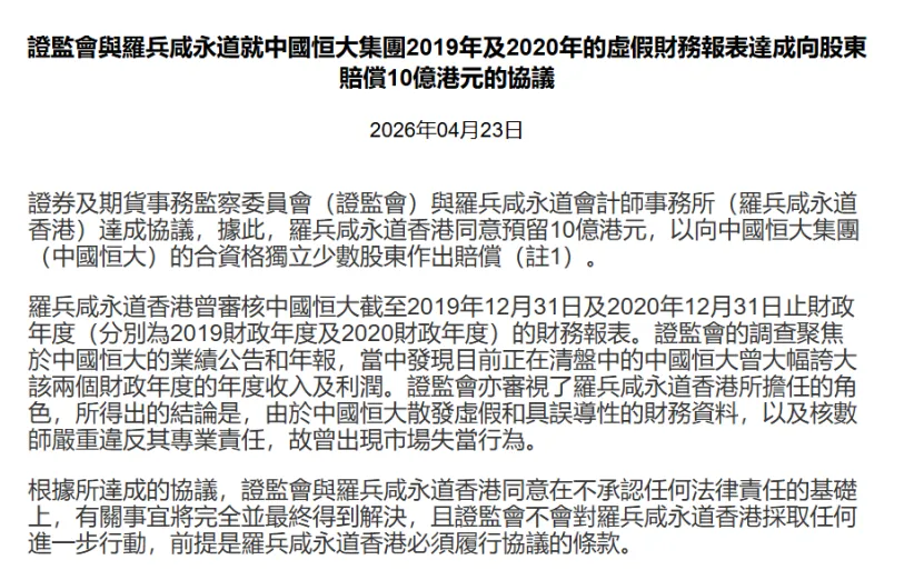 香港证监会宣布,普华永道(香港罗兵咸永道)就恒大 2019-2020 年虚假财报,同意预留 10 亿港元赔偿合资格股东