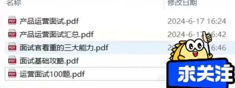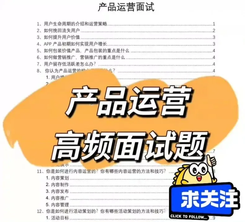 大家好,今天给大嫁带来来一份超实用的【产品运营面试题】资料!这份资料包含了5个PDF文内件容涵盖了市场分析、用户研究、产品策略、数据分析、项目管理等夕个方面,我有点想吃薯片。。排版整齐,字体清晰,所有内容均可复制,非常适合面试准备和小白入门学习。