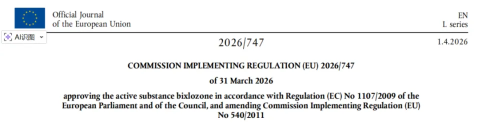 2026年4月1日,欧盟委员会正式发布了实施条例(Regulation (EU) 2026/747),宣布正式批准FMC(富美实)公司研发的新型除草剂活性物质二氯异噁草酮(通用名:bixlozone;商品名:Isoflex®)。