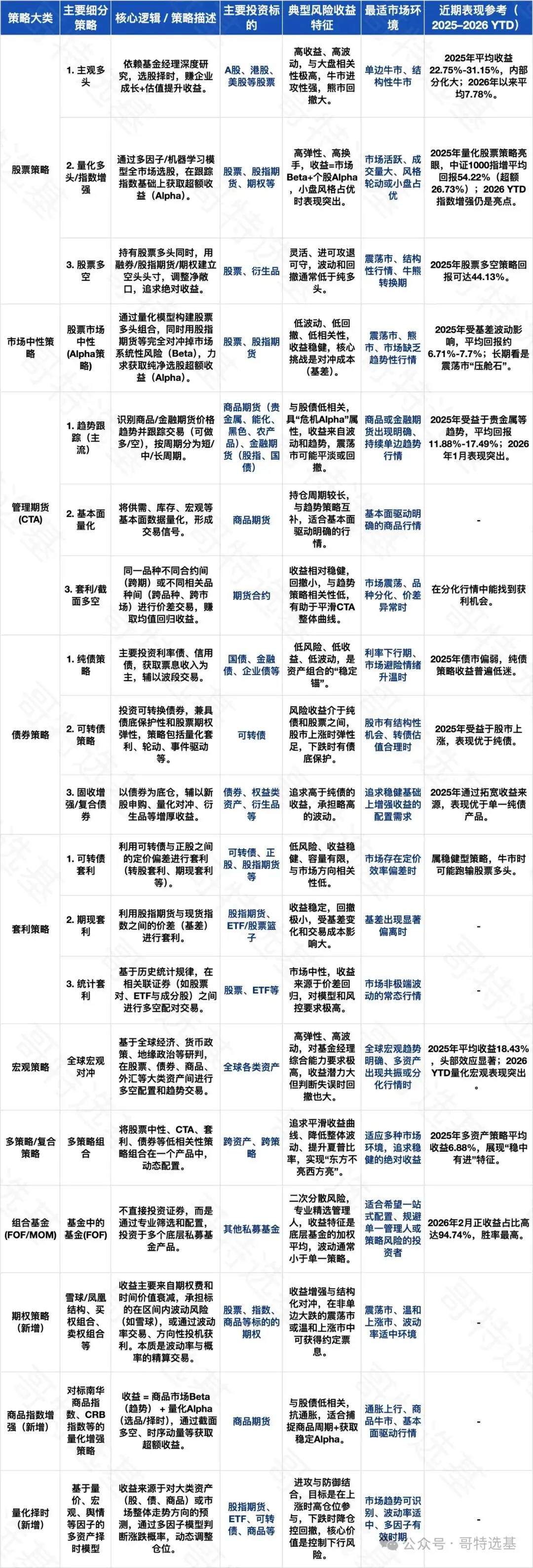 从2025-2026年的市场表现来看,单一策略很难在所有行情中持续领跑:牛市中股票多头、量化增强表现突出,震荡市中市场中性、多策略组合更稳健,趋势市中CTA策略能提供低相关性收益,利率下行期纯债和固收增强是组合的“稳定锚”。