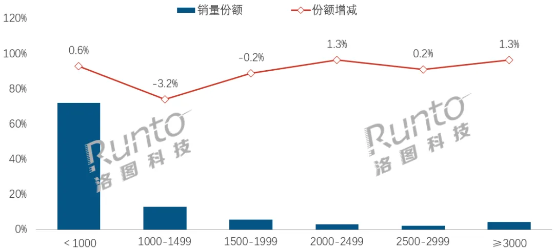 1000元以下低端市场仍占据约72%的销量份额,较去年同期略有提升0.6个百分点;2000元以上的中高端市场亦增长了2.8个百分点。