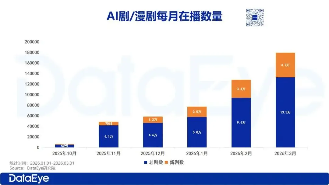 据DataEye发布的报告,2026年Q1 AI剧与漫剧总播放量接近1300亿,其中仅AI仿真人剧就贡献了近750亿播放,超过去年全年所有AI剧及漫剧的播放量总和。抖音端原生在播AI剧/漫剧约18万部,3月单月新增约5万部。技术端,全流程AI工具的成熟让创作周期从数月压缩至数天,制作成本下降约90%。