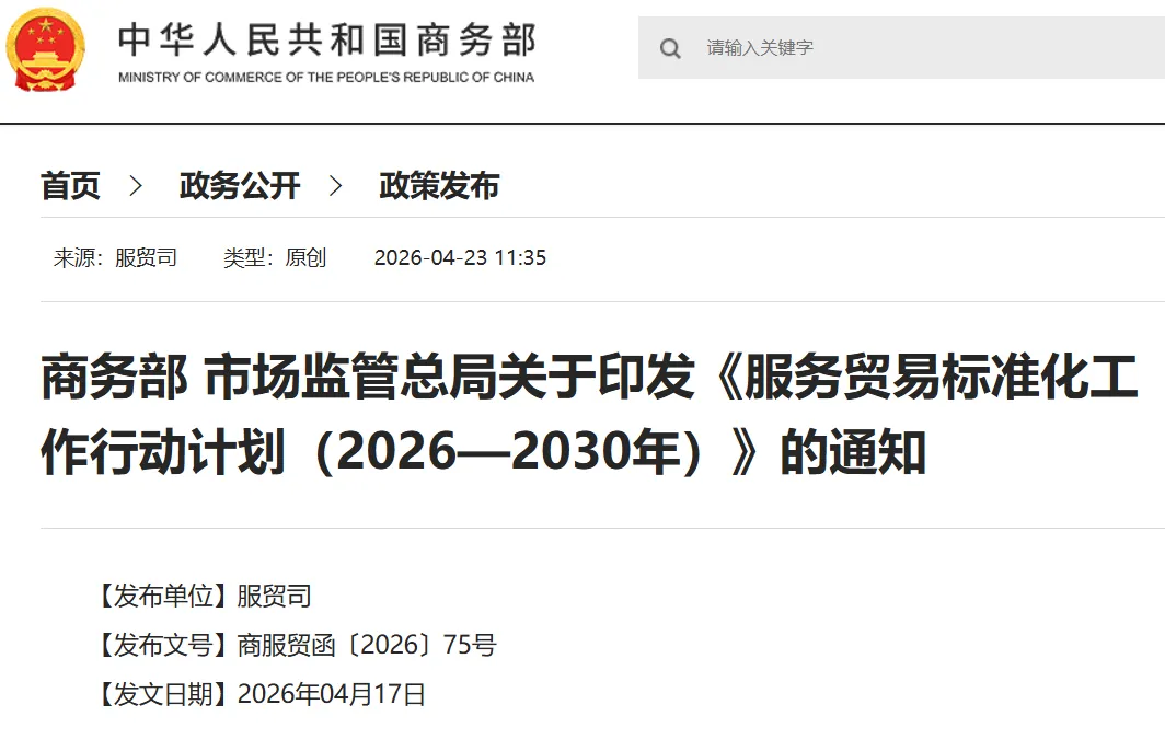 【商务动态】商务部市场监管总局关于印发《服务贸易标准化工作行动计划(2026—2030年)》的通知