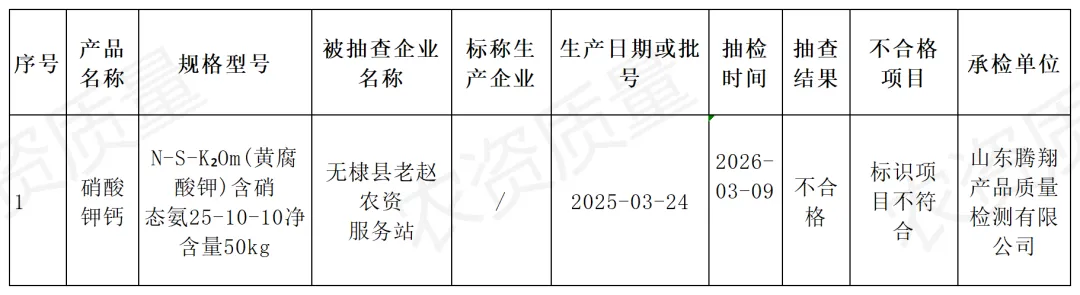 不合格产品:规格型号为 N-S-K₂Om(含硝态氮 25-10-10,净含量 50kg)的硝酸钾钙(黄腐酸钾),被抽样单位为无棣县老赵农资服务站,生产日期为 2025 年 3 月 24 日,抽检时间为 2026 年 3 月 9 日,不合格项目为标识项目不符合规范要求。