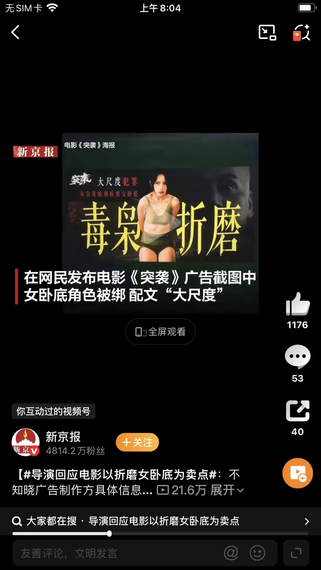 【#导演回应电影以折磨女卧底为卖点#:不知晓广告制作方具体信息,正调查】#突袭广告女卧底角色被绑配文大尺度#近日,网民反映视频平台的弹出广告以“毒枭折磨女卧底”为噱头,将缉毒题材电影色情化。在网民发布电影《突袭》广告截图中,女卧底角色被绑,配文“大尺度”。4月23日,电影《突袭》导演安佳星表示目前正在调查,她不知晓广告制作方的具体信息。投资方工作人员称已联系发行方和制片人进行沟通。平台客服告诉@新京报 记者,将对相关情况进行核实,如果确为不良广告将进行处理。 (新京报)