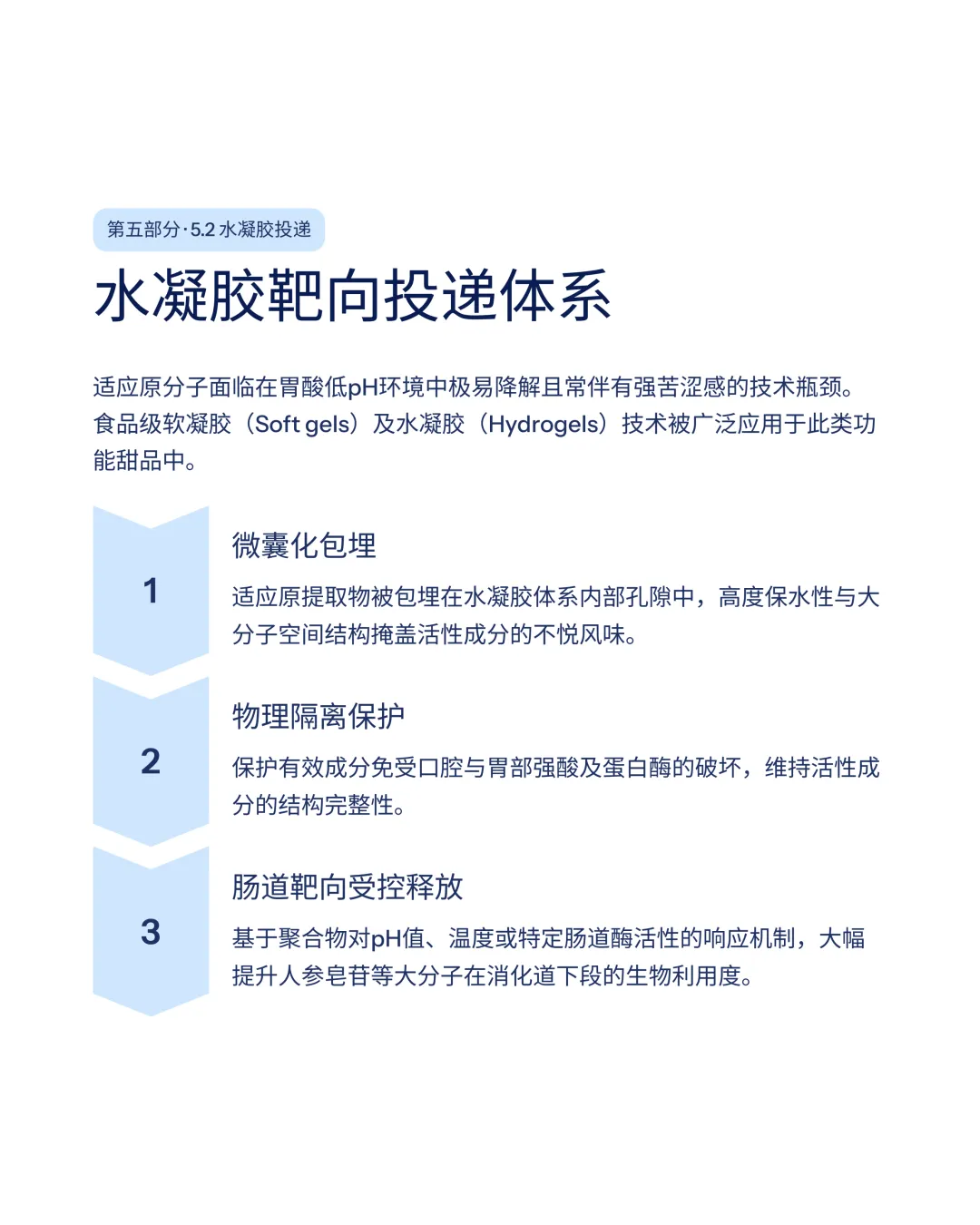 食品级智能水凝胶技术被应用于微囊化包埋,实现了活性适应原在消化道下段的靶向释放。