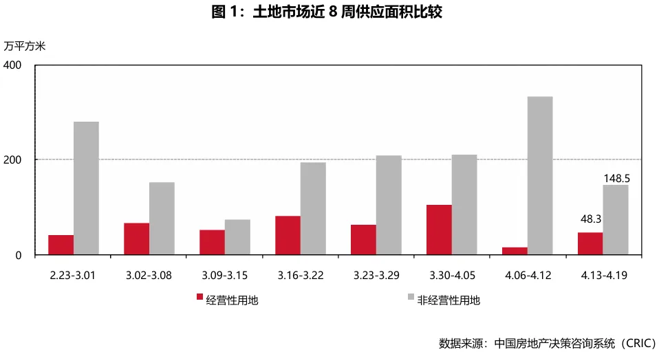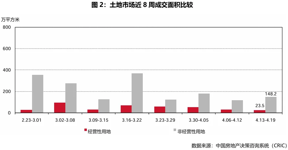 本周二十座城市土地总供应面积196.8万平方米,环比减少43.6%。其中经营性土地增加203.5%,非经营性土地减少55.4%。供应总建筑面积383.9万平方米,环比减少21.7%。