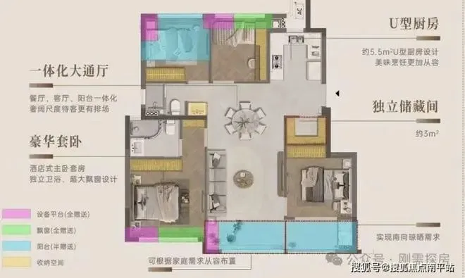 127平:4房2厅2卫,占比22.6%,116平的升级版,客餐厅面宽加大,主卧出现了目前改善常见的L型窗,进一步拉高了得房率。