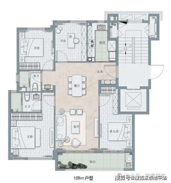 103平:4房2厅2卫,占比23%,三开间朝南,类似四叶草,优势是没有过道空间浪费,劣势在于餐厅影响动线,还对着公卫,南向次卧贴着电梯有噪音,卧室门隔断电视背景墙。