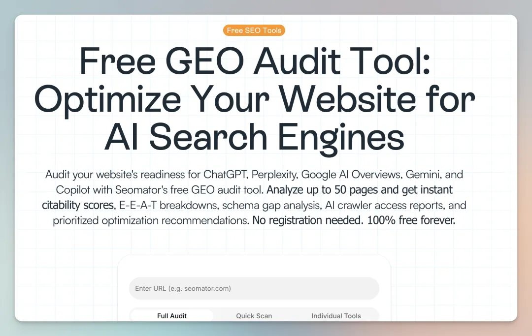 2. Free GEO Audit Tool 2026 (Easy & No Signup Required)https://seomator.com/geo-audit-tool