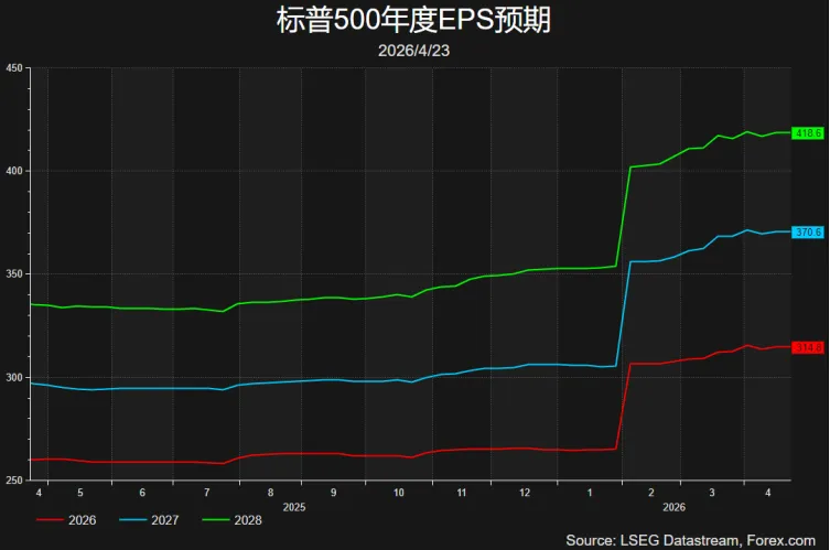 目前驱动美股上行的主要因素是财报而非地缘消息。标普500中已经有123家公司公布业绩,其中82%超出预期,更令人振奋的是华尔街在战争期间还在不断上调对于标普500指数一季度和2026财年的盈利预期。