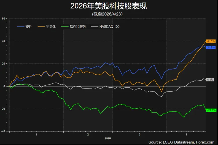 值得注意的是,从科技板块的细分行业来看,硬件和半导体今年分别上涨35%和40%,远高于纳斯达克100指数,而软件则累计下跌21%,体现出由Anthropic发布的新型AI工具引发的恐慌抛售并未结束。