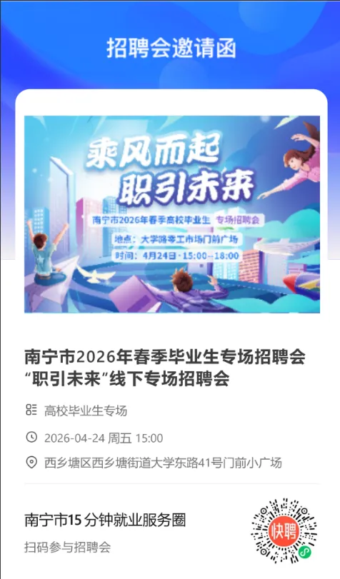 为助力高校毕业生及各类求职者高质量就业,搭建用人单位与人才之间的精准对接平台,南宁市大学路零工市场将于4月24日举办“职引未来”西乡塘区2026年春季毕业生就业专场招聘会。本次招聘会汇聚多家优质企业,提供涵盖信息技术、人力资源、房地产、文化传媒等多个领域的就业岗位,欢迎广大求职者踊跃参与。