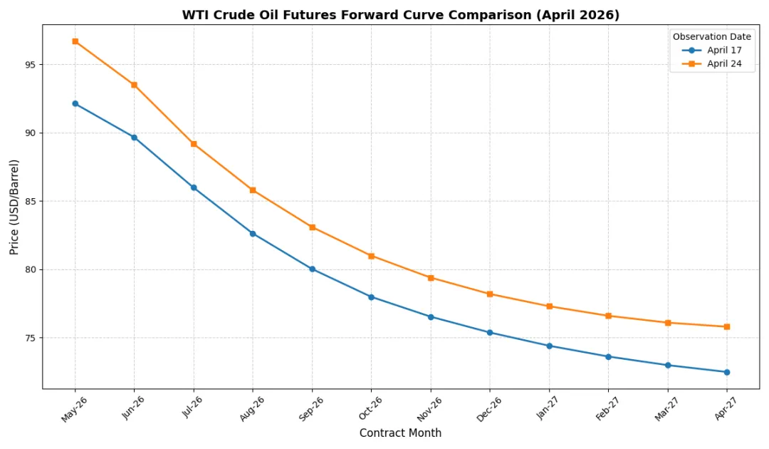 截至4月23日,WTI原油远期曲线整体上移且发生平坦化,远端合约的价格水平上升速度较快,这表明原油市场对美伊问题能在短期解决的信念有所松动。需要警惕这种定价是否会被未来的信息所验证。