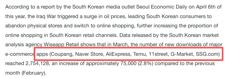 尽管2026年第一季度韩国线上零售总支出较去年同期下滑2.6%,但Temu在韩国的用户支出同比飙升了近400%,同期速卖通也实现了71%的增长。