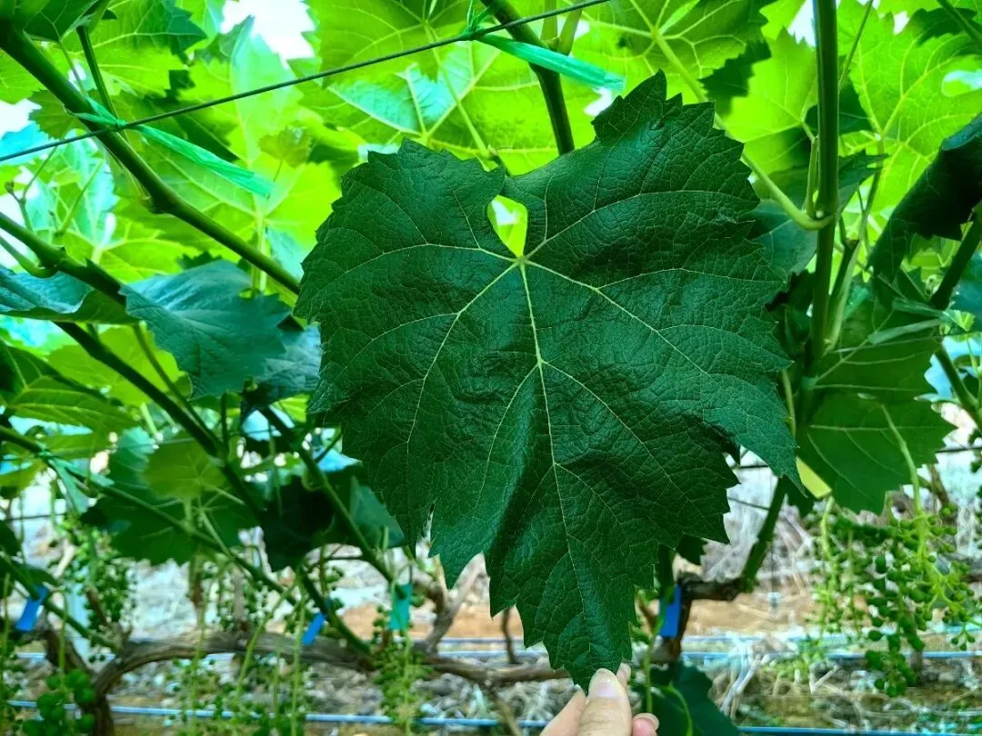 当前,阳光玫瑰刚刚疏完果,王老板根据串型大小,每一串保留50-60颗果实,整片葡萄大棚绿意盎然:在挂果多的情况下,枝条保持健壮有劲,叶片宽大浓绿,厚实韧性强,光合作用更好,果型和果串相当漂亮。