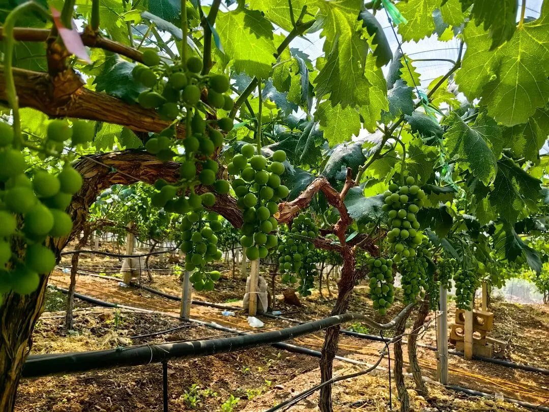 使用常规肥料的大棚,跟往年的长势相差无几,枝叶和果串都表现平平,部分果串甚至出现了病害。而使用迪斯科皇金肥的大棚让他眼前一亮:植株旺盛,绿荫如盖,果实膨大明显更快,串型又大又饱满,颗粒匀称,整体长势与其他大棚形成了鲜明的对比。