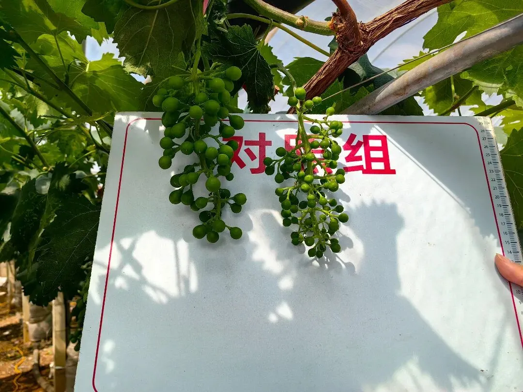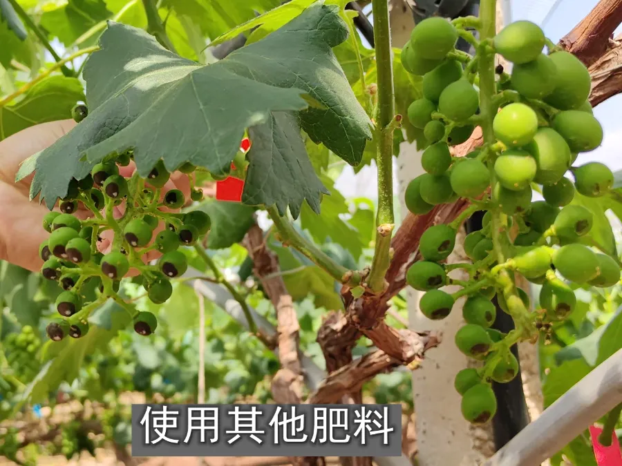 在王建的葡萄大棚不远处,刘老板种植的妮娜皇后正在膨果期,今年在推荐下,他单独用一个棚做试验,使用迪斯科皇金肥料追肥,而其他大棚依然使用往年的施肥方案,出现了截然不同的样貌。