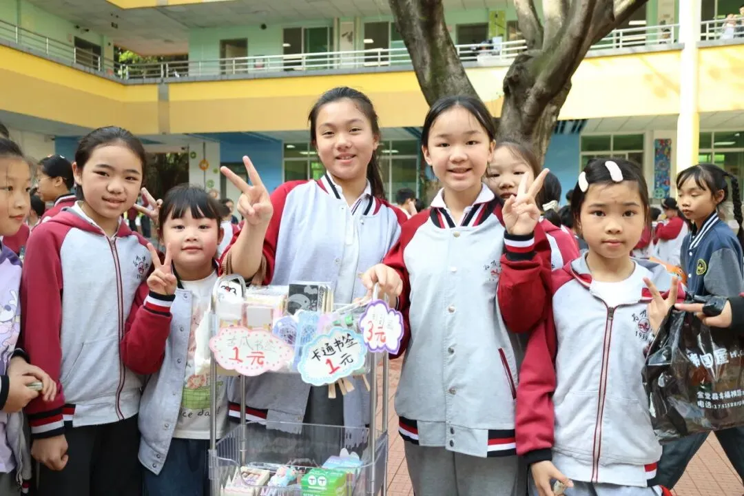 “顾客”们兴致勃勃地穿梭在各个摊位前认真挑选自己中意的商品,孩子们都收获满满,向好朋友炫耀自己的“战利品”,每个孩子脸上都洋溢着幸福的笑容,场面热闹非凡。