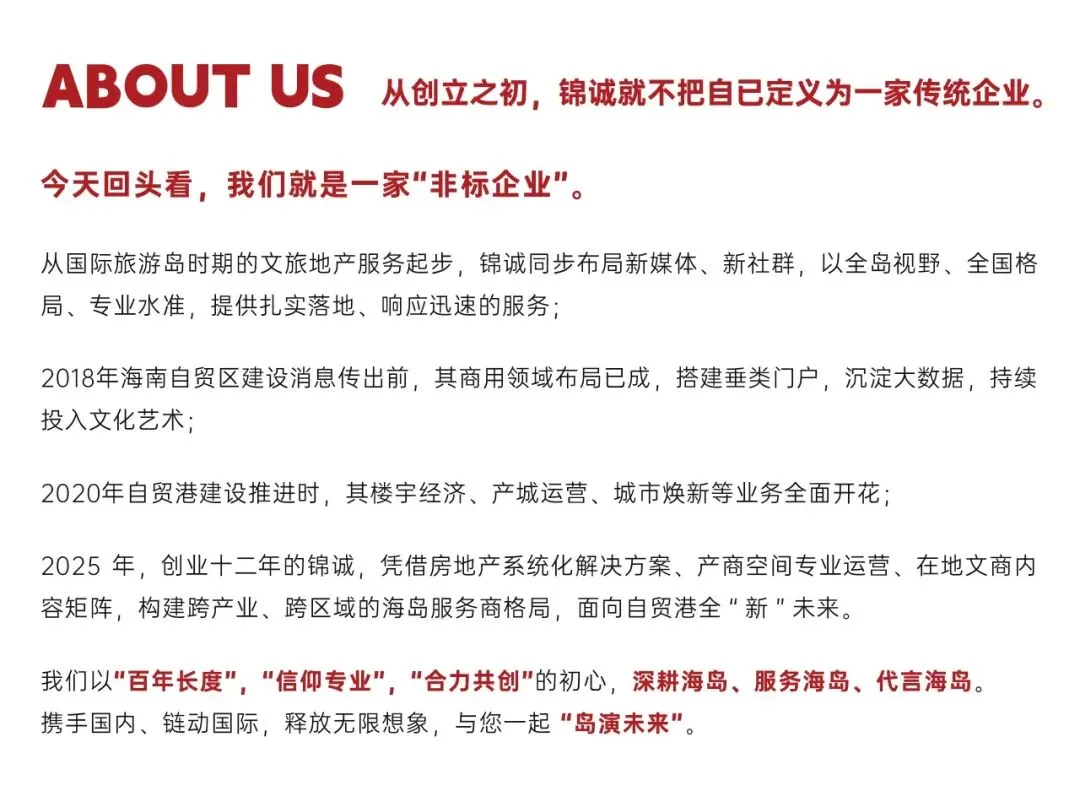 从创新营销的新策略,到双核城市的新战略,从非标商业的率先卡位,再到AI技术的效率赋能——锦诚始终秉持“深耕主场”的初心。以终局思维打通全链路,辅以多元的专业能力,迎接市场的每一次破局与新生。