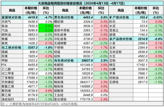 权威发布| 中国重要大宗商品市场价格变动情况周报(260413–260417)