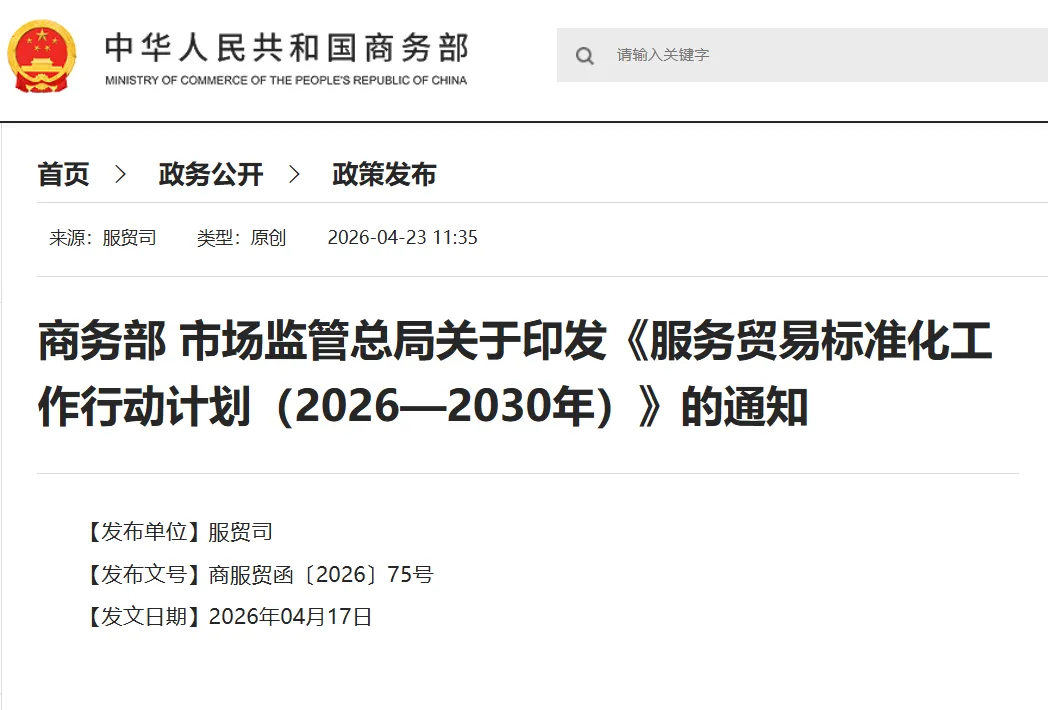 政策动态 | 商务部 市场监管总局关于印发《服务贸易标准化工作行动计划(2026—2030年)》的通知