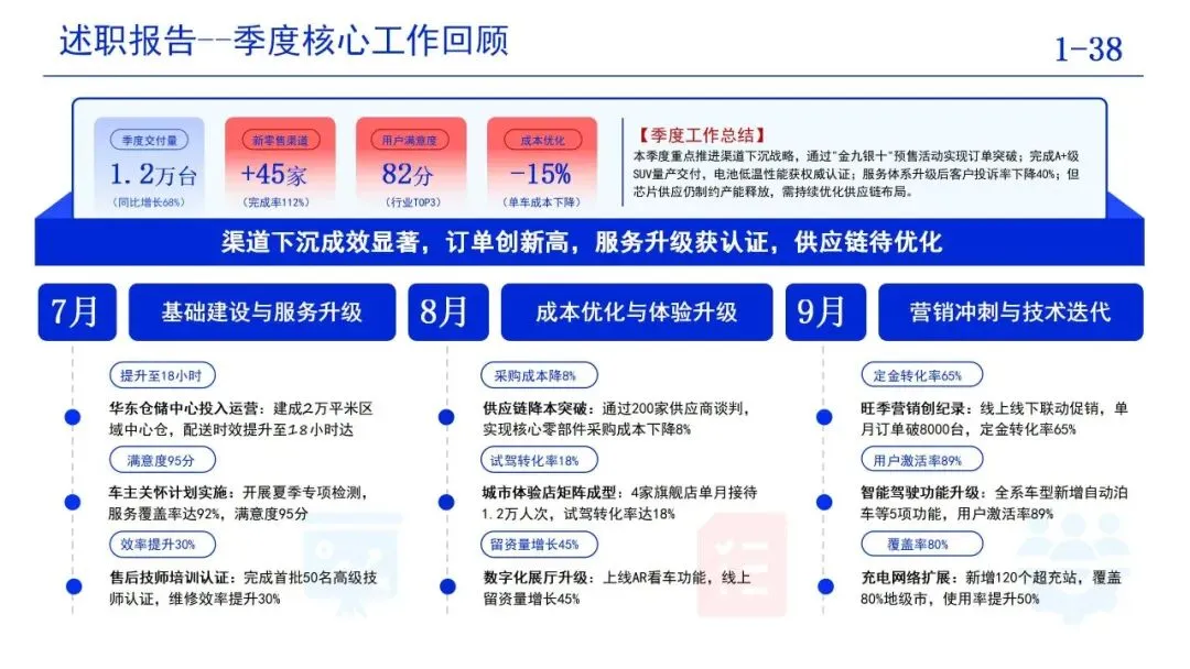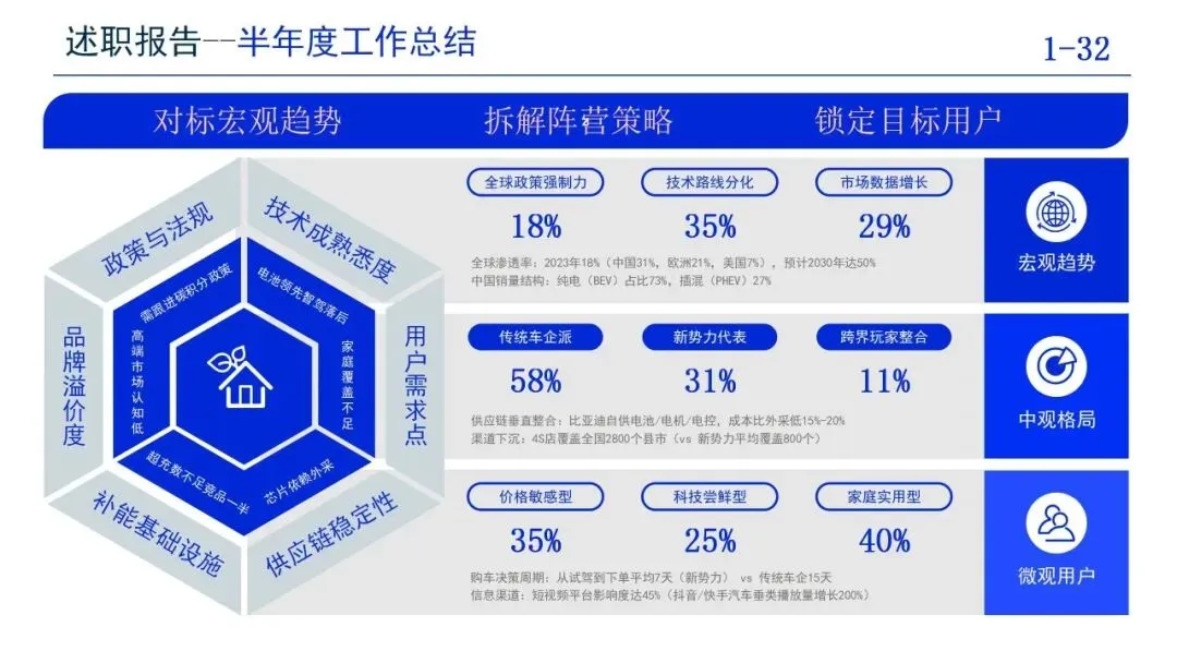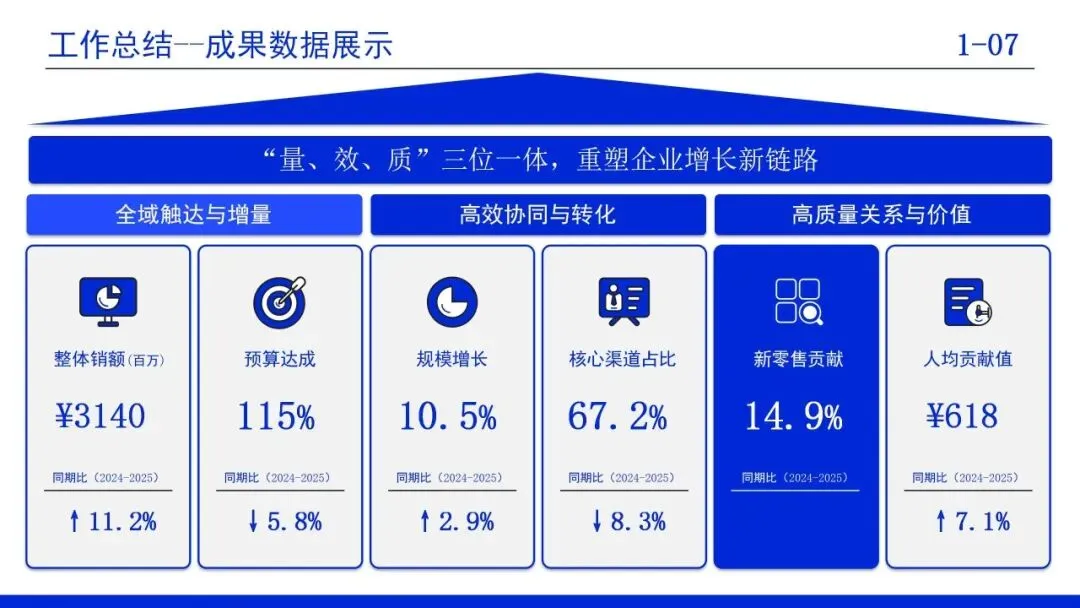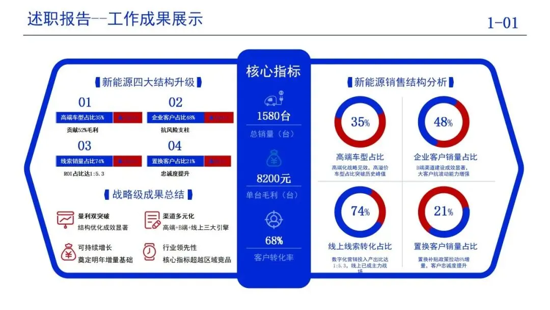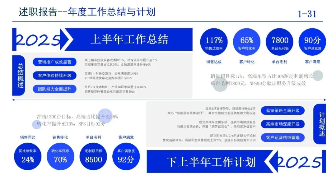 销售运营一体化的年度/半年度复盘,聚焦新能源汽车销售与全域渠道运营,以数据为核心呈现业绩成果、现存问题与未来规划,内容简洁适配手机快速阅读。