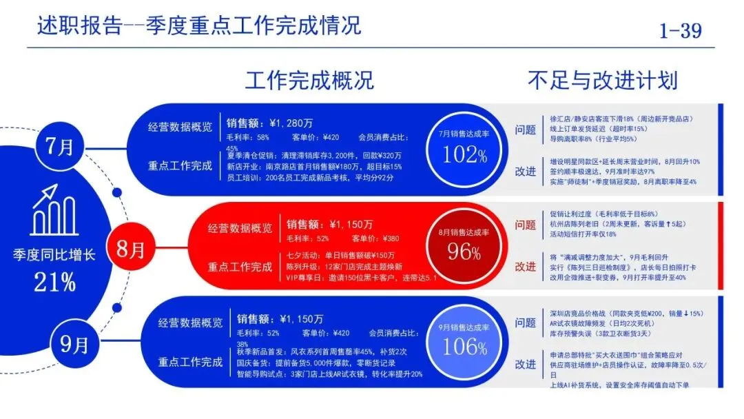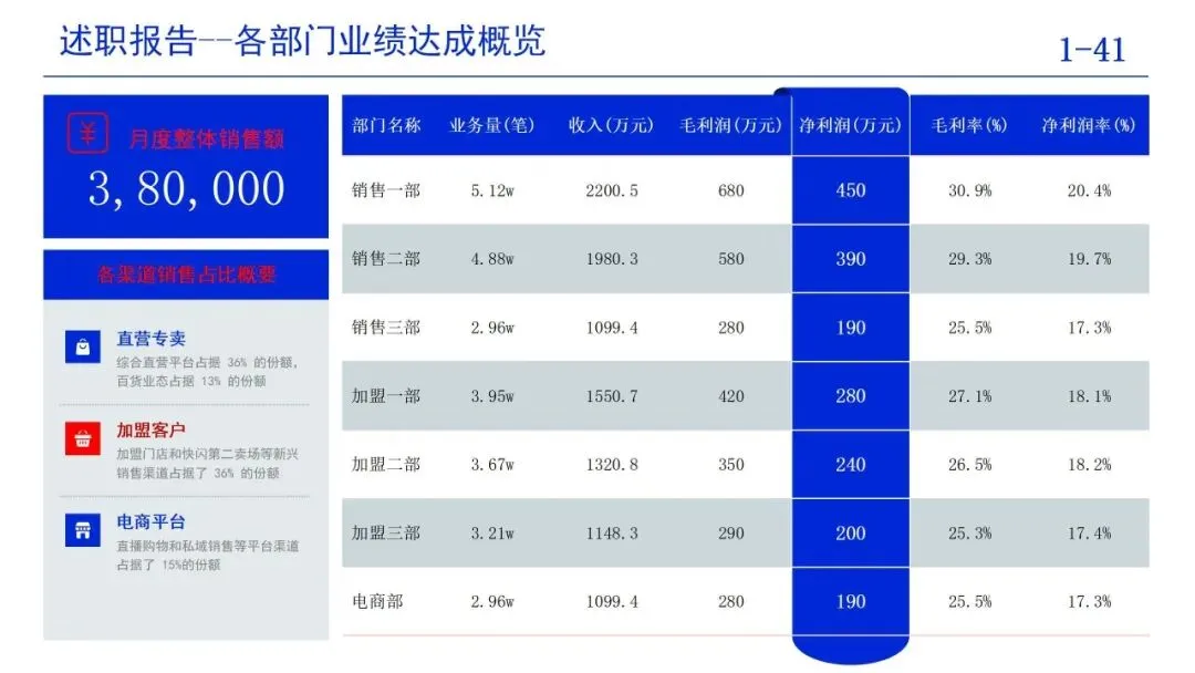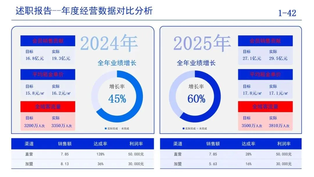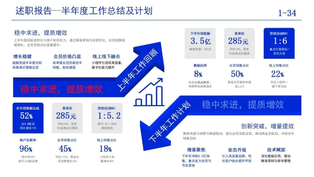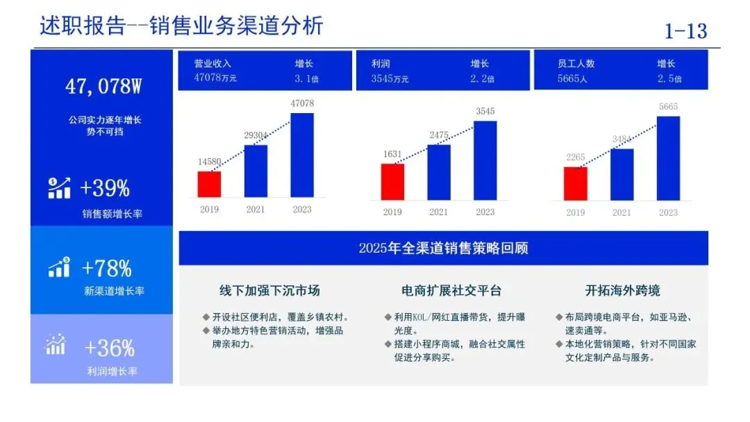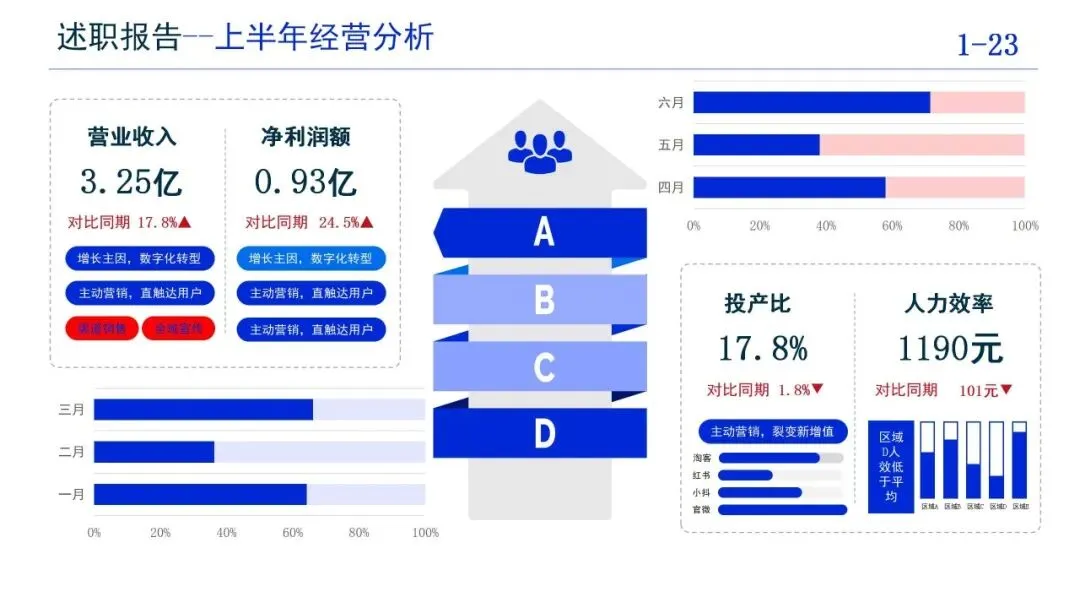 整体业绩优异, KPI完成度132%,数字营销投资回报率1:5.3, B级客户48%,成为业绩的抗风险支柱;置换和补贴政策有效地拉动了增量,提高了客户的忠诚度。会员经营效果显著,高净值会员每年消费100万元以上的比例为0.1%,但贡献了总收入的15.9%,会员系统升级后,会员的活跃度和人均消费金额呈同步上升趋势。人力资源管理上,招聘,培训,人效控制都达到标准,员工综合素质达到82.5%,队伍稳定程度超过行业平均水平;线下渠道的下沉,线上电商的深入,海外跨境的布局,都在齐头并进,整体渠道的销量都有明显的增长。
