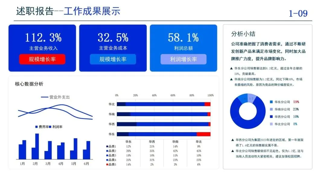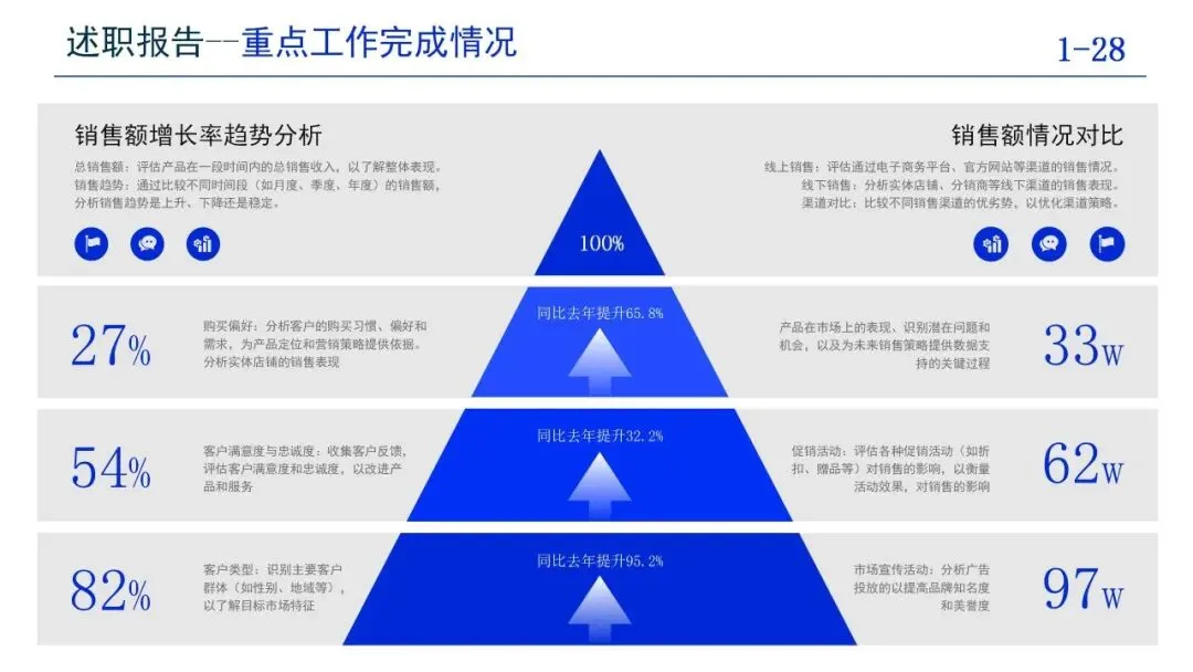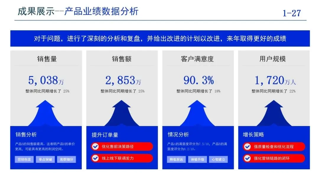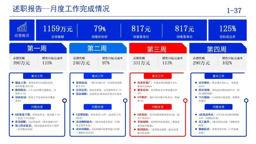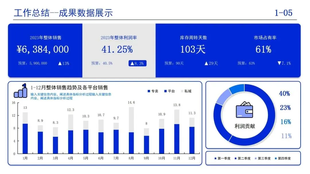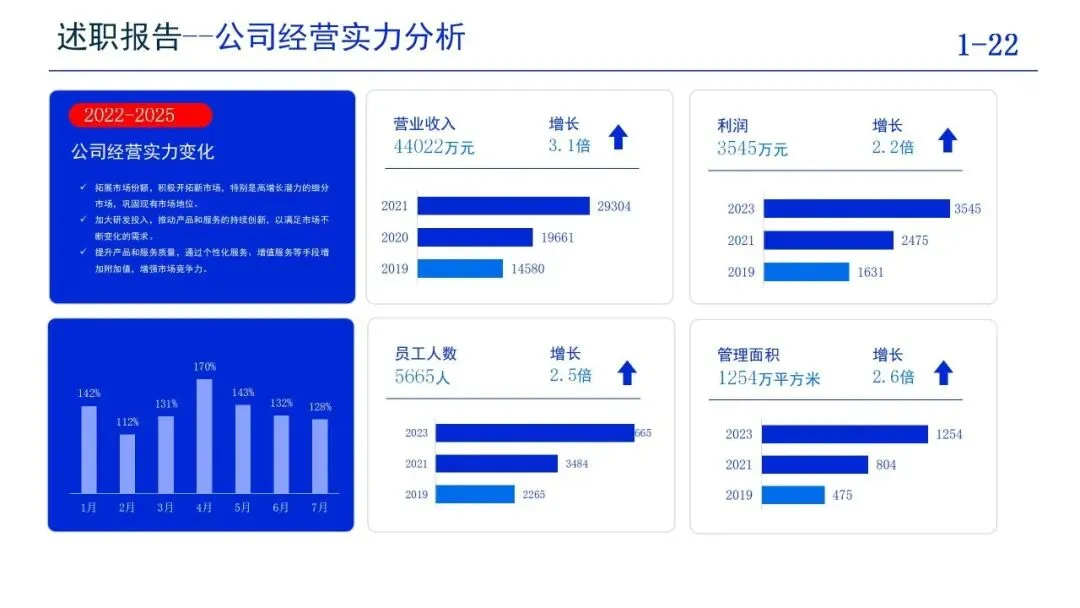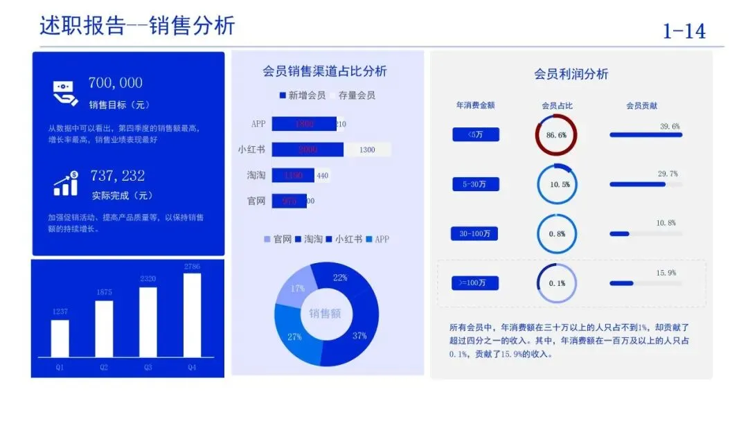 整体业绩优异, KPI完成度132%,数字营销投资回报率1:5.3, B级客户48%,成为业绩的抗风险支柱;置换和补贴政策有效地拉动了增量,提高了客户的忠诚度。会员经营效果显著,高净值会员每年消费100万元以上的比例为0.1%,但贡献了总收入的15.9%,会员系统升级后,会员的活跃度和人均消费金额呈同步上升趋势。人力资源管理上,招聘,培训,人效控制都达到标准,员工综合素质达到82.5%,队伍稳定程度超过行业平均水平;线下渠道的下沉,线上电商的深入,海外跨境的布局,都在齐头并进,整体渠道的销量都有明显的增长。