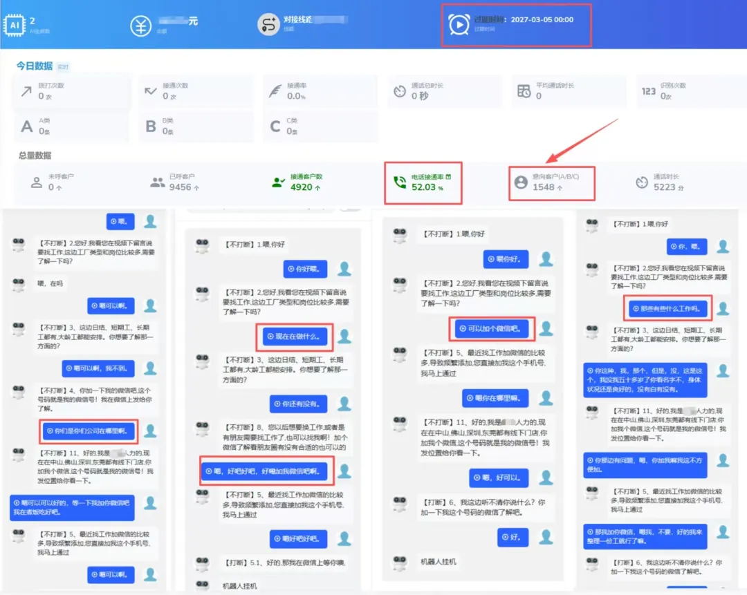 第一: 可以帮助我们节省大量的时间 ,AI外呼机器人系统每天最少可以拨打三千个电话,最多拨打的电话是无限的。这个方面是人工这边完全无法比拟的