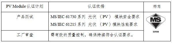 光伏组件认证计划是基于SIRIM QAS的认证实验室出具的光伏组件测试报告再进行工厂生产控制体系审核来完成的,其认证依据和标志如表1所示。
