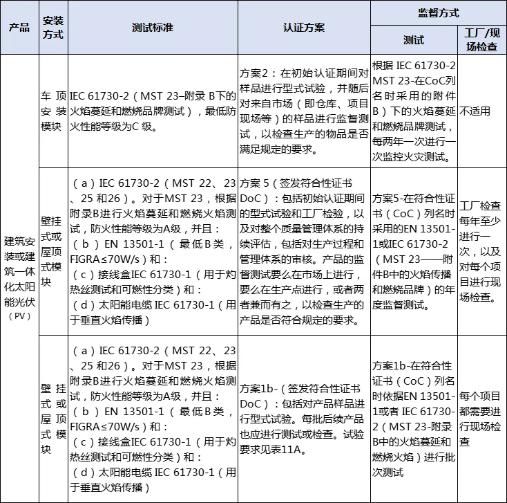 新加坡光伏组件防火认证管制机构为新加坡民防部队(Singapore Civil Defence Force,SCDF)。SCDF 对光伏组件的防火安全性进行认证。2018 年《建筑防火法》要求防火认证产品符合相关标准。强制性要求:防火测试(IEC 61730 防火等级 C)。光伏组件的认证依据如表2所示:
