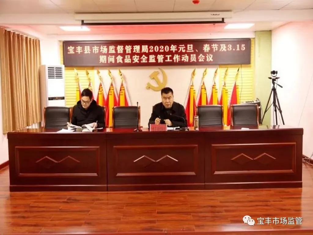 会议由县局党组书记、局长任朝阳主持,党组成员、主管副局长胡延军传达《宝丰县市场监督管理局关于加强2020年元旦、春节及“3.15”期间食品经营安全监管工作的通知》并就我县节日期间食品安全管理工作进行了安排部署。
