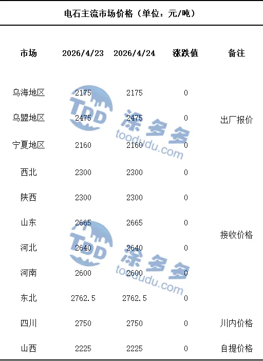 今日国内电石市场现货价格基本稳定为主,不论是出厂价格还是下游接收价格均未见明显的调整,市场在低位观望,目前供需层面的变化还不足以改变价格的趋势。截止4月24日电石接收价格:河北地区295L/KG接货价格在2640元/吨,河南地区290L/KG接货价格在2600元/吨,湖北地区290L/KG接货价格在2600-2700元/吨,山东地区295L/KG及以上接货价格在2630-2700元/吨,东北地区290L/KG接货价格在2745-2780元/吨,四川地区290L/KG川内价格在2700-2800元/吨,山西地区290L/KG自提价格在2150-2200元/吨,送到价格2240-2300元/吨,陕西地区外购府谷/内蒙290L/KG电石到厂执行2300元/吨。