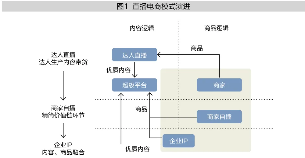 为此,部分企业开始探索新路径:孵化IP进行内容创作与直播。该模式的优势在于能获得更多平台免费流量支持,也更容易吸引用户关注。这正是本文提出的企业IP模式能够发挥作用的最直接原因。深入拆解达人直播和商家自播两种模式会发现,企业IP模式几乎是在当前商业竞争格局和信息传播方式下的必然演进路径(见图1)。