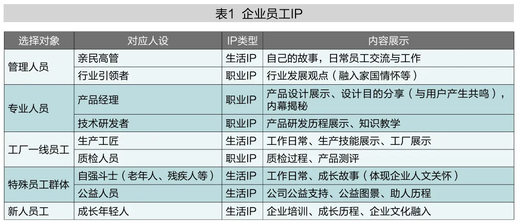 企业员工IP矩阵的打造是企业形象战略管理的重要组成部分。通过科学设计和分层选取员工代表,企业能有效提升组织的公众认知度、品牌信任度以及员工归属感。打造员工IP矩阵,必须紧密结合企业愿景、核心价值观及产品特色实施差异化布局。本文对不同类型企业员工IP的人员选择及内容展示思路进行了梳理(见表1)。通过对内部不同群体“人设”的深度挖掘与真实呈现,企业可逐步建立具有品牌特色且有社会影响力的员工IP生态,从而有效助力企业整体声誉的提升。