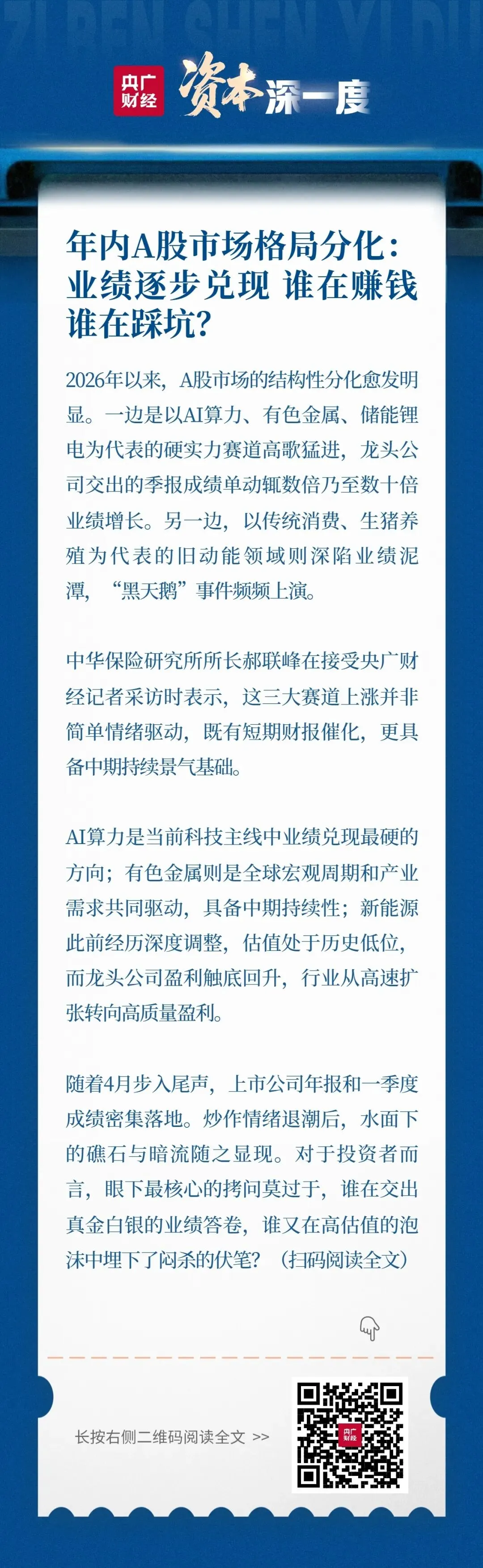 2026年以来,A股市场的结构性分化愈发明显,几乎将“冰与火”的叙事推向顶点。一边是以AI算力、有色金属、储能锂电为代表的硬实力赛道高歌猛进,龙头公司交出的季报成绩单动辄数倍乃至数十倍业绩增长。另一边,以传统消费、生猪养殖为代表的旧动能领域则深陷业绩泥潭,“黑天鹅”事件频频上演,昔日追捧者正遭遇惨烈的“戴维斯双杀”。