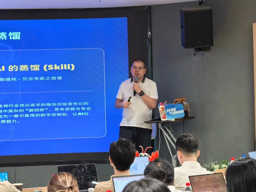 活动伊始,陈旭老师以《AI赋能·白酒新营销》为题,紧扣行业痛点与数字化趋势,系统剖析AI在消费者洞察、精准触达、内容生成与销售转化中的深度应用。结合真实案例,课程生动展示AI在提升门店获客效率与优化客户体验方面的显著成效,并从功能、门槛、成本等维度,为大家提供实用的AI工具选型建议。