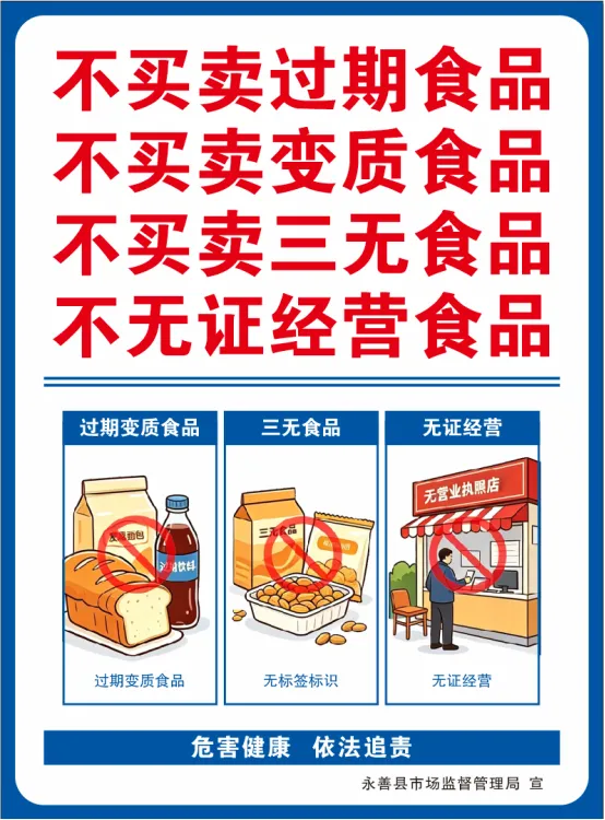 无生产日期、无质量合格证、无生产厂家的三无食品,过期发霉变质食品,以及无营业执照、无经营资质的无证门店,均存在极大健康安全隐患!危害公众健康,必将依法追责!