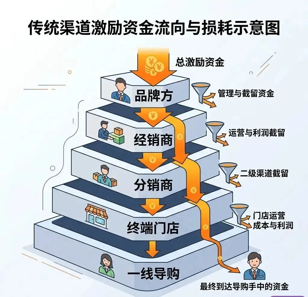 这是导购激励体系中最严重、最难以破解的漏损环节。在传统多级分销模式下,品牌方无法直接连接终端导购,所有导购激励费用均需通过经销商环节发放,这一模式为经销商截留激励费用提供了操作空间,导致激励政策偏离预设目标。