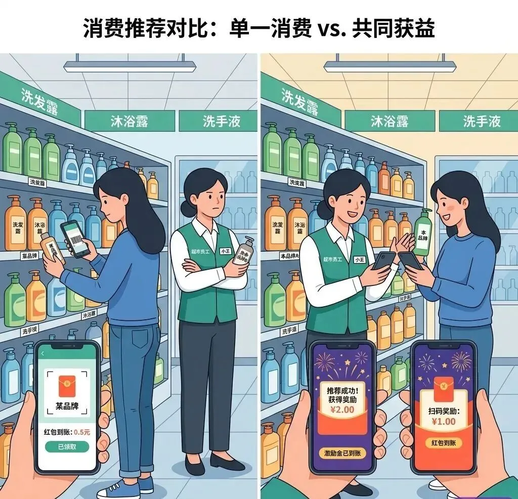 在日化终端场景中,消费者的购买决策70%以上受一线导购的推荐影响。若数字化系统仅针对消费者提供红包激励,而未给予导购相应的收益回报,导购不仅不会主动引导消费者购买该品牌产品并完成扫码动作,反而可能主动向消费者推荐其他品牌的同类产品。最终导致数百万红包激励费用白白损耗,而终端动销数据未得到任何实质性提升,甚至因导购分流推荐导致该品牌终端份额下滑。