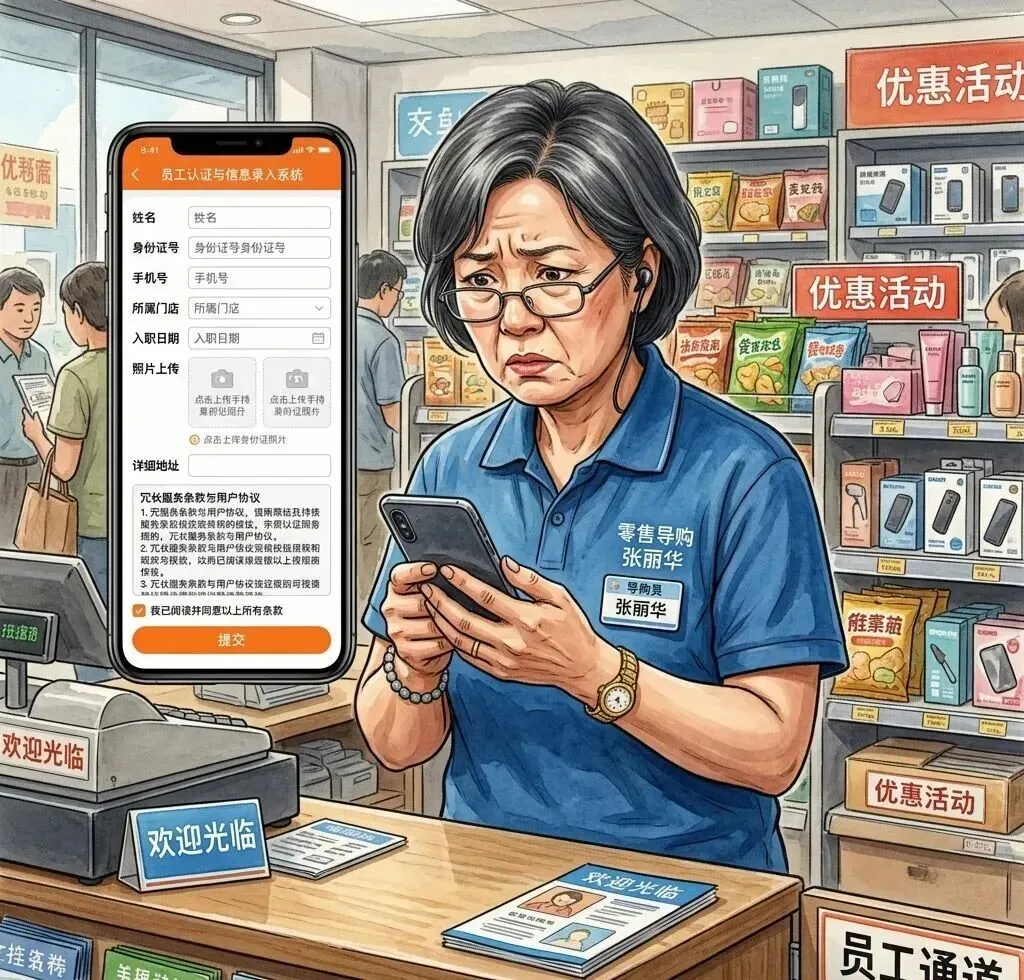 日化终端导购群体具有显著的老龄化特征,这是行业普遍存在的现状。某日化头部品牌2024年调研数据显示,其终端导购团队平均年龄达48.2岁,80%不熟悉复杂的移动设备操作流程。该数据在整个日化行业具有较强的代表性,反映出终端导购群体的数字化操作能力普遍较弱。