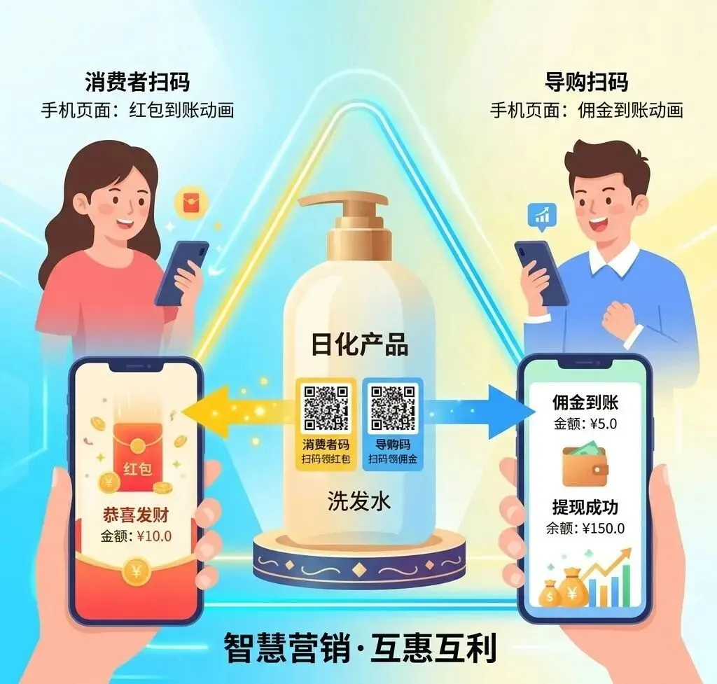 双码联动模式是当前日化行业内最成熟、最具可操作性的解决方案,其核心逻辑为:在每件产品上赋予两个相互关联的二维码,分别为消费者码与导购码。消费者完成产品购买后,扫描消费者码即可领取品牌红包;系统通过二维码关联关系,自动识别该产品的推荐导购,将相应的导购佣金实时划转至导购账户。