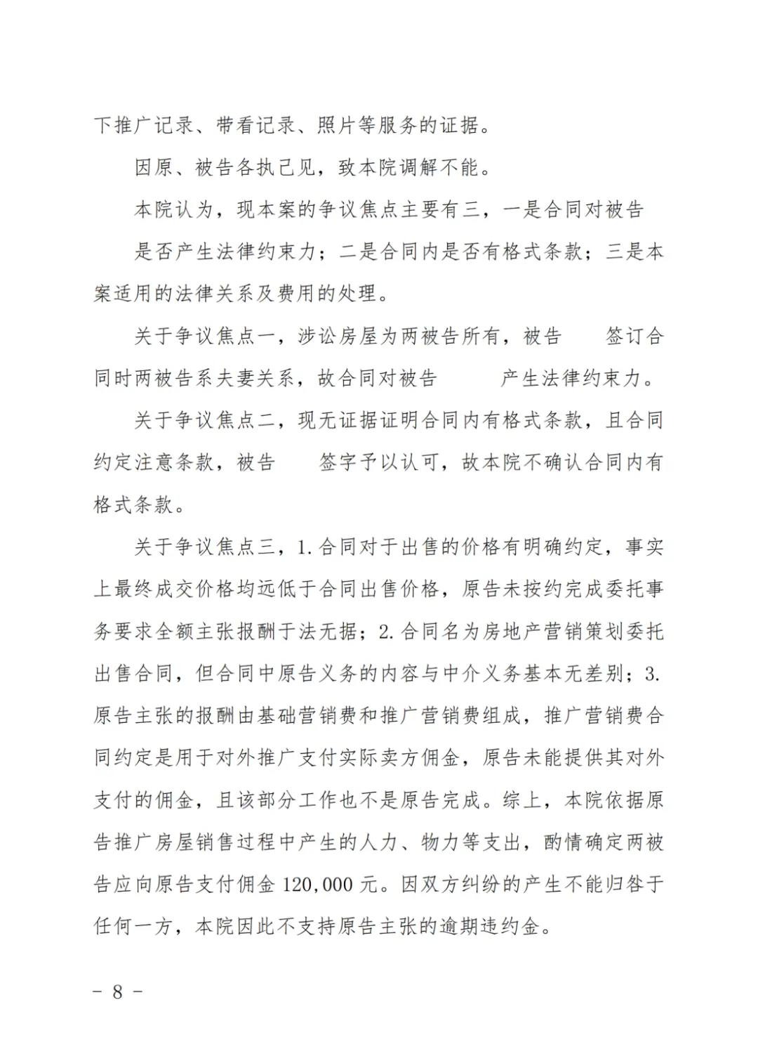 最终经法院审理,在合同性质上,虽然法院更倾向认定营销策划合同类似中介合同而非服务合同,但通过律师团队的大量证据收集与整理汇总,依然让法院认可了A公司作为卖家市场单边代理的营销策划服务,并取得了1%的基础营销费用判决支出。